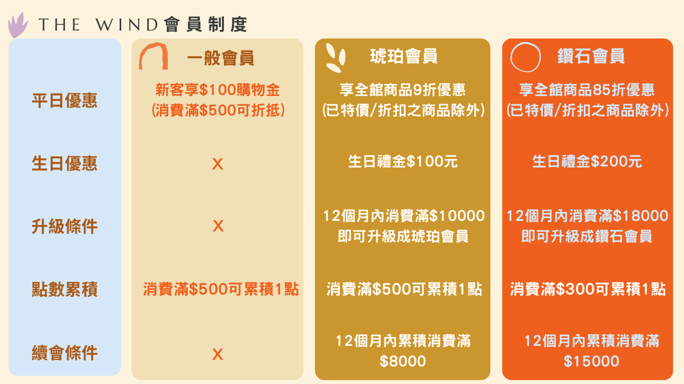 歡迎加入 The Wind 會員制度,讓每一次購物都更有價值!